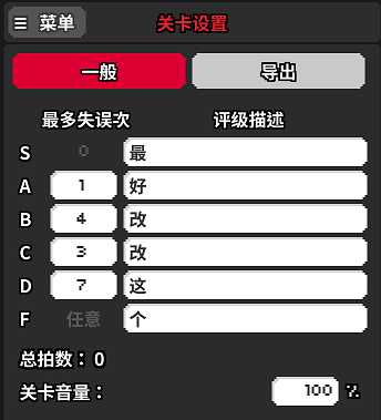 上半部分填写的是成绩S到F分别失误的拍子数量,以及显示的评价文字。这东西最好不要一股脑保持默认值,而是根据做谱的情况来合理修改,难度不大,那就数字写小,难度很大,那留出来的容错空间也应该更大。