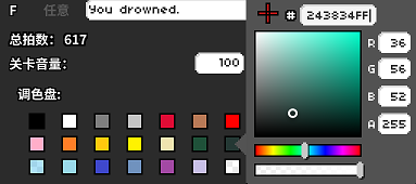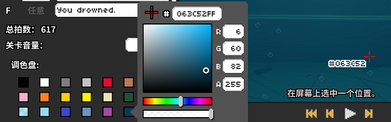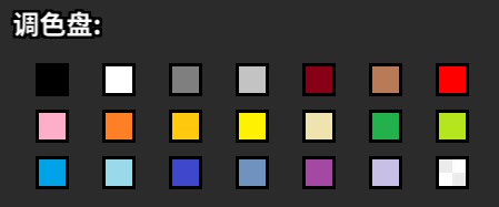 下半部分是可供自定义的调色盘,制作谱面的时候,可能需要频繁地选择颜色。但形如 #FFFFFFFF 的颜色代码实在是不便于记忆。这时候,调色盘就可以派上用场。
