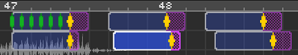如果不对其添加任何其他设置,那么轨道就会自动变成 —x—x—x————♥ 的模式,像4-1这关的矿工一样,也就是在1,3,5,7拍有按压的动画效果。当然你可以在“设置X标记”这个项目里面选择跳过节拍的形式,默认有三种情况,如果想使用“切换为不可见拍子设置”来自由决定跳过也是可以的,先在“设置X标记”里面选择NO,然后设置好自己决定的不可见拍子就行了。
