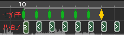 八拍子就更好理解了,我们直接额外增加一个节拍,让按拍的时机在第八拍响起的时候。但是轨道上是只能显示七个拍子的,所以我们依然要依赖分解成自由拍,以2 1 2 3 4 5 6 7的形式响起节拍。设置的方法如下图所示: