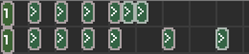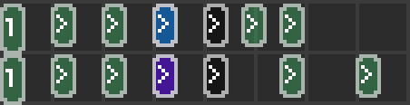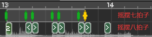 切分音的概念不难理解,拍子的数量仍然为七个,但是最后一个拍子响起的时间是在6.5拍的时候,即提早了半拍。这少的半拍时间是可以发生在任意相邻两拍之间的。早期版本的编辑器需要使用自由拍来制作切分音,现在在切换为X字拍子设置里,点亮激活拍子下方的->>>>>-符号,就会将这一拍的时间缩短一半。每个轨道最多只能设置一个切分音位置。