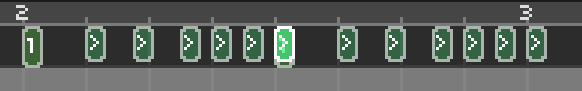 我们选中数字1对应的节拍,发现这个是设置起始脉冲位置的。你甚至可以将它改为第七拍,然后把六个小的>删掉,这样就没有任何节拍提示。如果你设计的关卡是一个和节奏医生没什么关联的创意谱(梦幻联动?),且按键密度很大,则可以考虑这样使用。相比于工作区里面重叠摆放一大堆普通七拍子,这样会看上去更清爽。但如果你设计的就是节奏医生,请不要在完全无节奏提示的情况下直接响起第七拍。