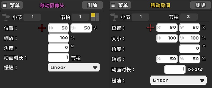 就其功能本身而言,实际上内容和移动轨道并无太多差别,只是作用的对象分别是摄像头和房间而已。移动摄像头在紫色的版块中,移动房间在黄色的版块中。