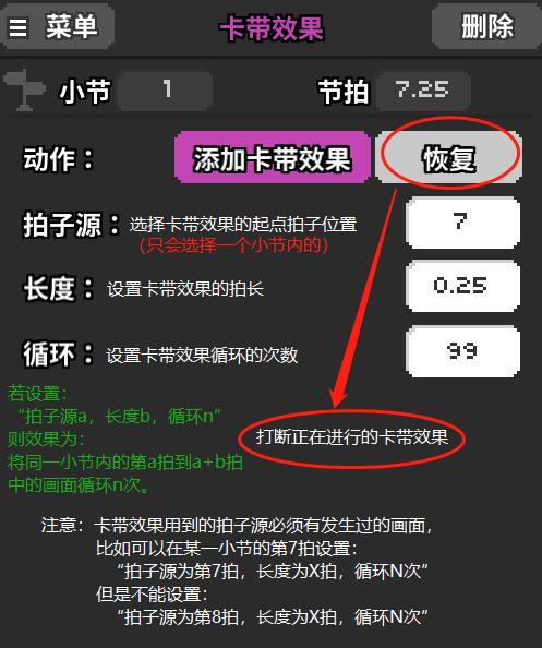 其中带有“动画时长”设置的事件(例如轨道移动,浮动文字)是要特别注意的,例如你填写了动画时长为2拍,同时又设置速度为2倍,那么该事件就在1拍的时间里完成了。
