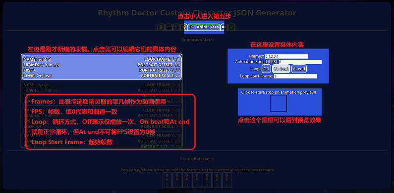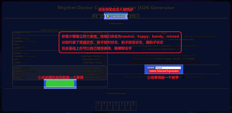 "name":后续出现的name指的是人物的各个表情,neutral表示普通表情,happy表示拍子按对时的表情,barely表示拍子按歪时的表情,missed表示漏过没按时的表情。这四个表情是默认存在的,因为和按拍效果有关,但你也可以在此基础上增加新的表情,自己命名一个其他表情,这会在紫色版块