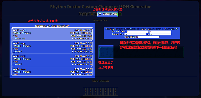 "portaitOffset":截取动图中的一部分作为显示对话时的立绘,两个数字表示截取立绘的起始位置。以每一帧画面的左下角作为原点,第一个数字为横坐标,第二个数字为纵坐标。