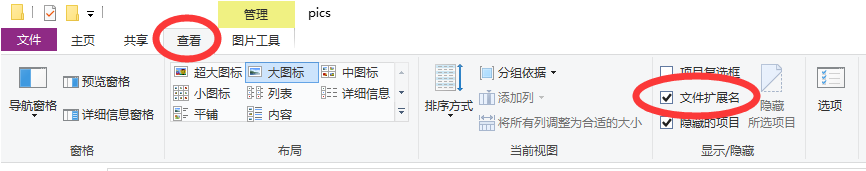 请注意在操作系统中显示文件的拓展名,以Windows10系统举例,在文件窗口上方的【查看】列表里,文件拓展名这一项应该是✔打勾的。 如下图所示。