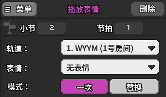 轨道就是选择需要变化表情的轨道,表情和json文件中的表情名是一一对应的。模式里的“一次”指的是播放新表情一遍之后自动回到原表情,“替换”指的是完全切换为新选择的表情。